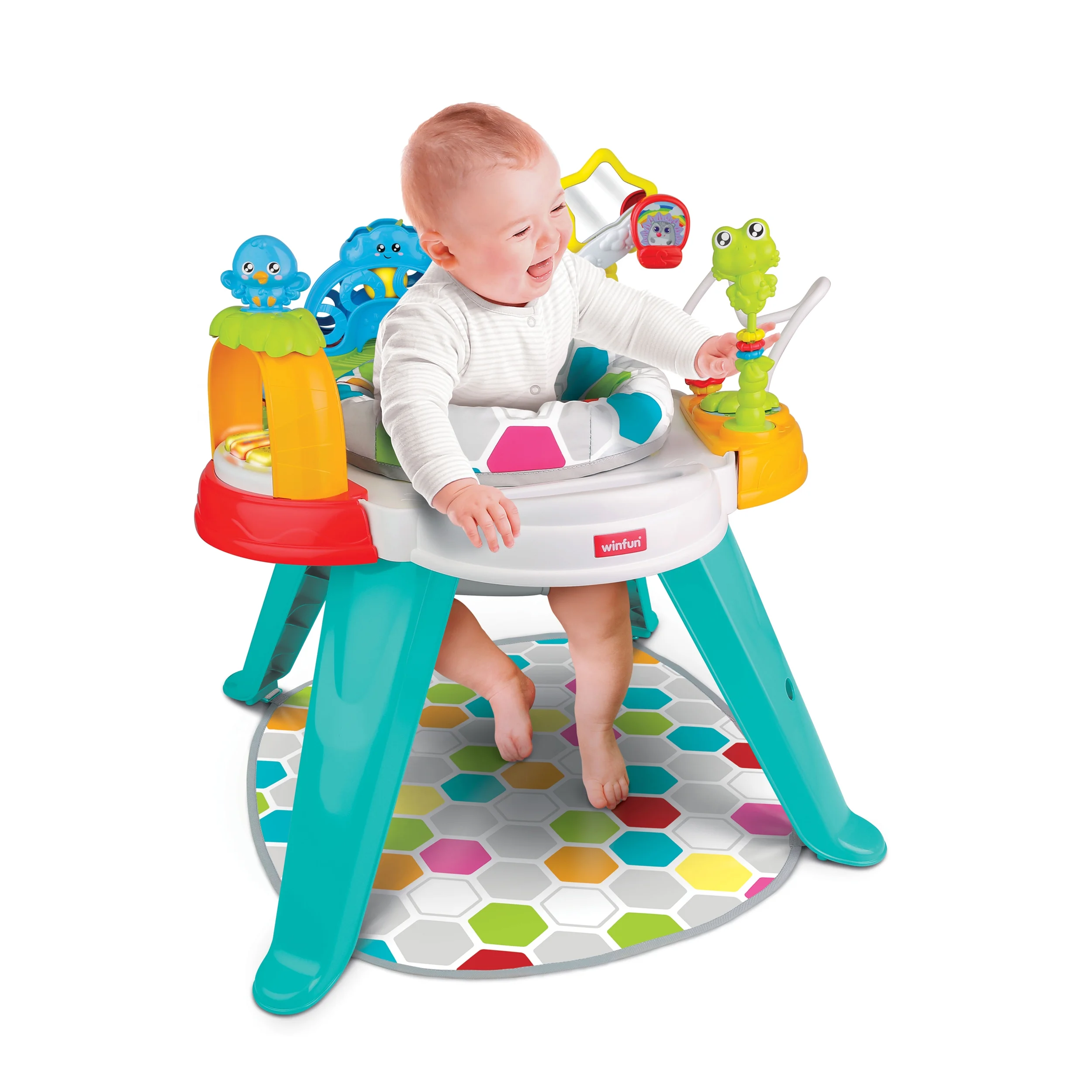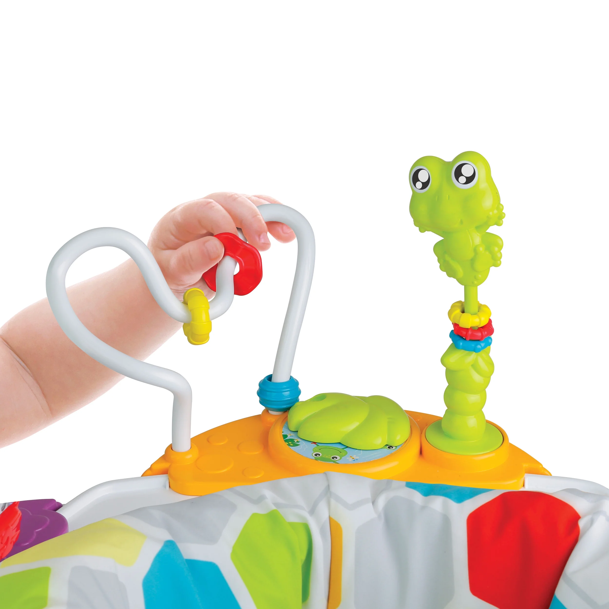 - Les modules d’activités comprennent un oiseau qui tourne, un lanceur de balles, une grande roue, un miroir pour bébé, des toupies coulissantes et un hochet grenouille détachable.