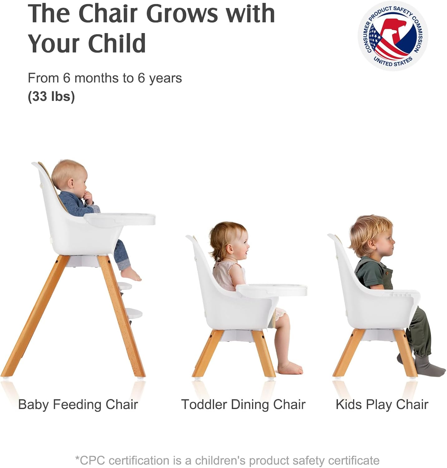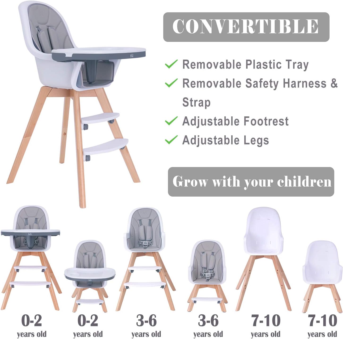 Chaise haute bébé 3en1 en bois, stable et sécurisée, avec harnais 5 points et double plateau réglable. Convient de 6 mois à 6 ans. Design moderne, facile à nettoyer.