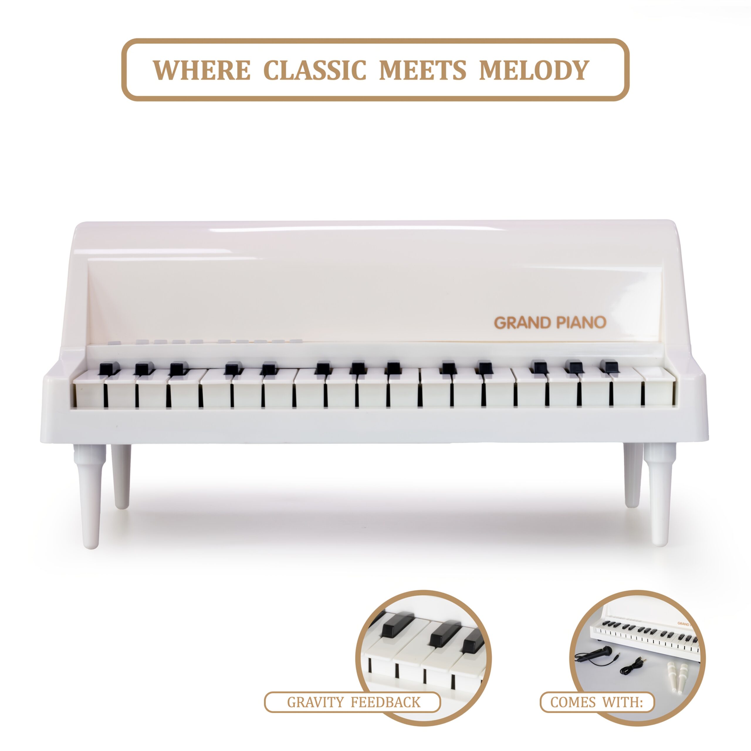 - Il est conçu comme une réplique miniature d’un piano droit avec un corps majoritairement en bois, lui conférant une sensation de solidité et de qualité.