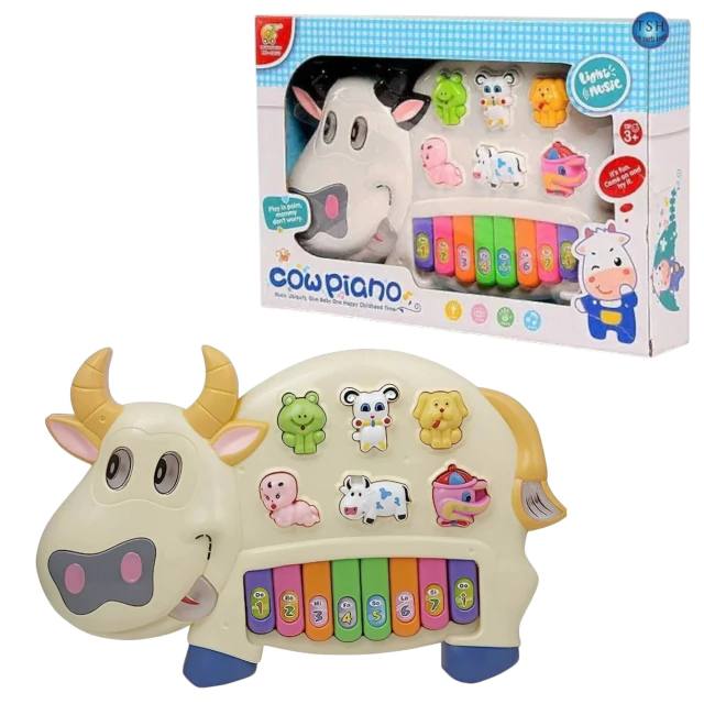 Ce piano ludique en forme de vache rigolote attire l’attention des tout-petits grâce à ses couleurs vives, ses sons amusants et ses touches lumineuses.