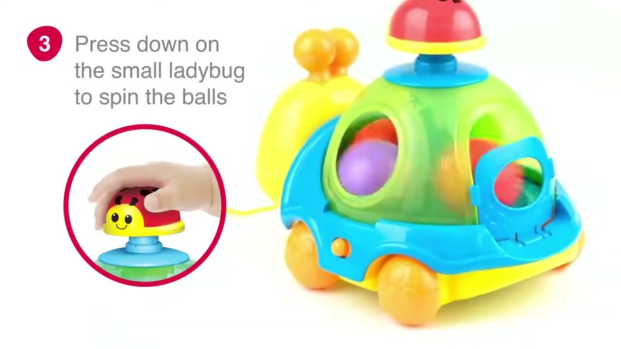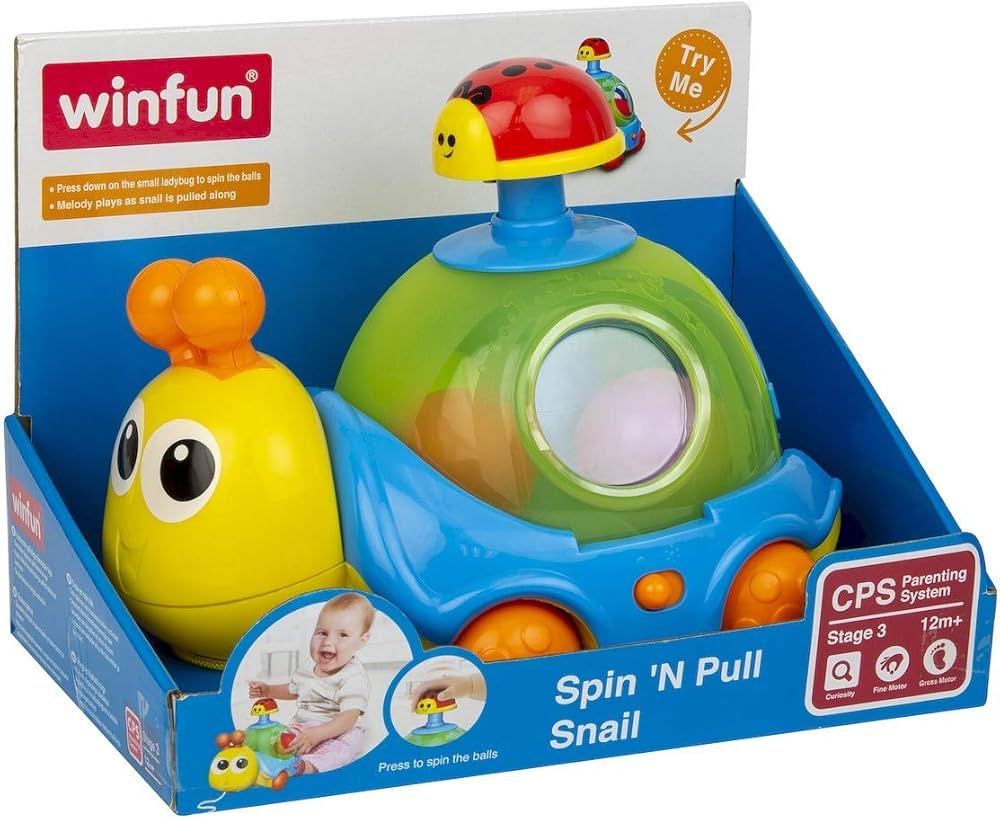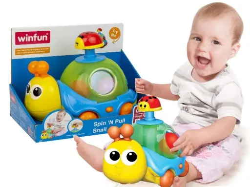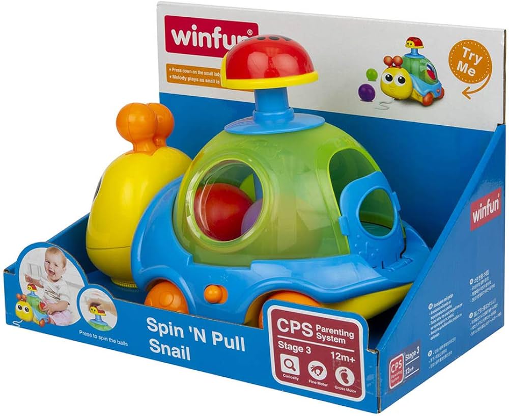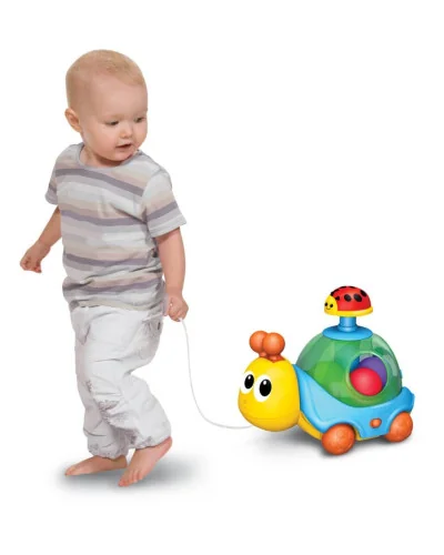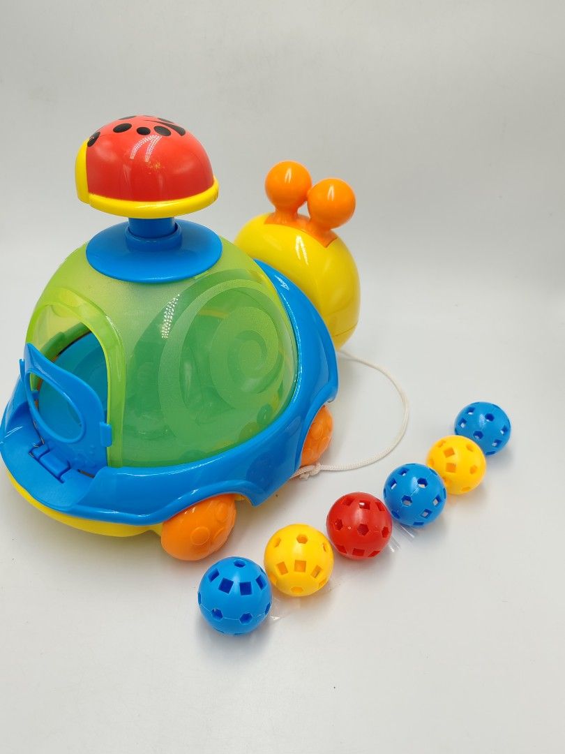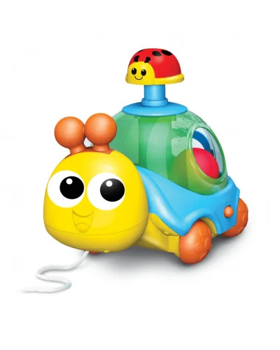 - Le jouet est un escargot à tirer avec une activité de balle tournante à l’intérieur de sa coquille.