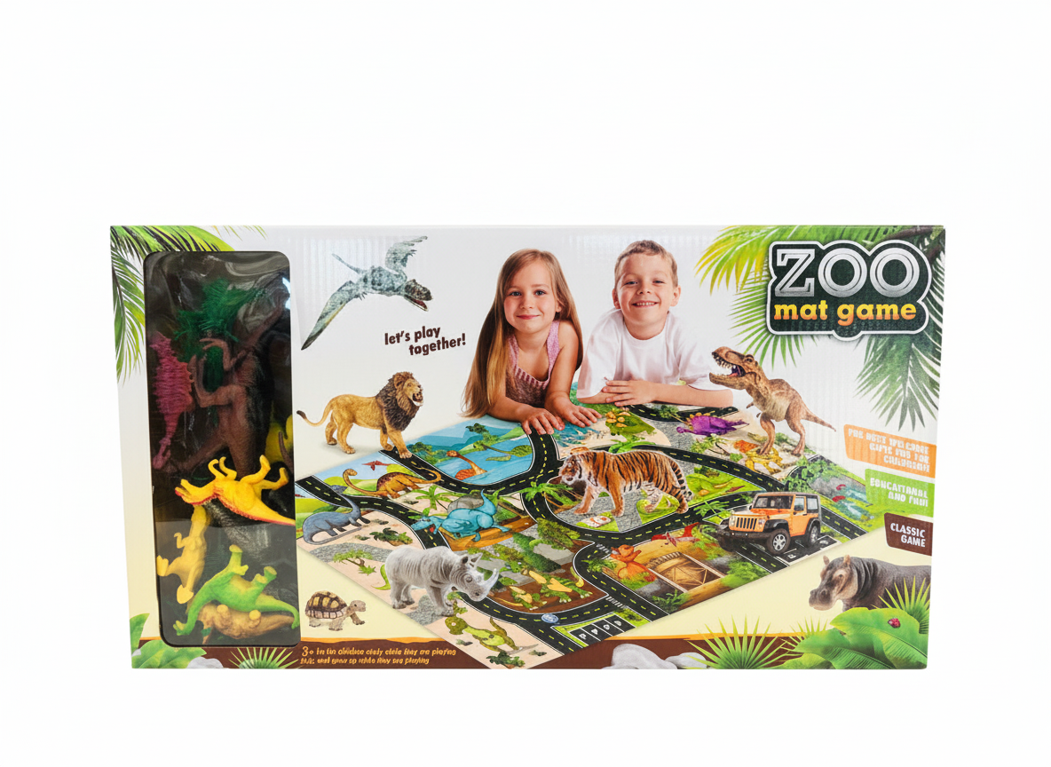 - Type de produit : Un ensemble de jeu comprenant un tapis imprimé avec des routes et un paysage de zoo/jungle, ainsi que des figurines d’animaux.
